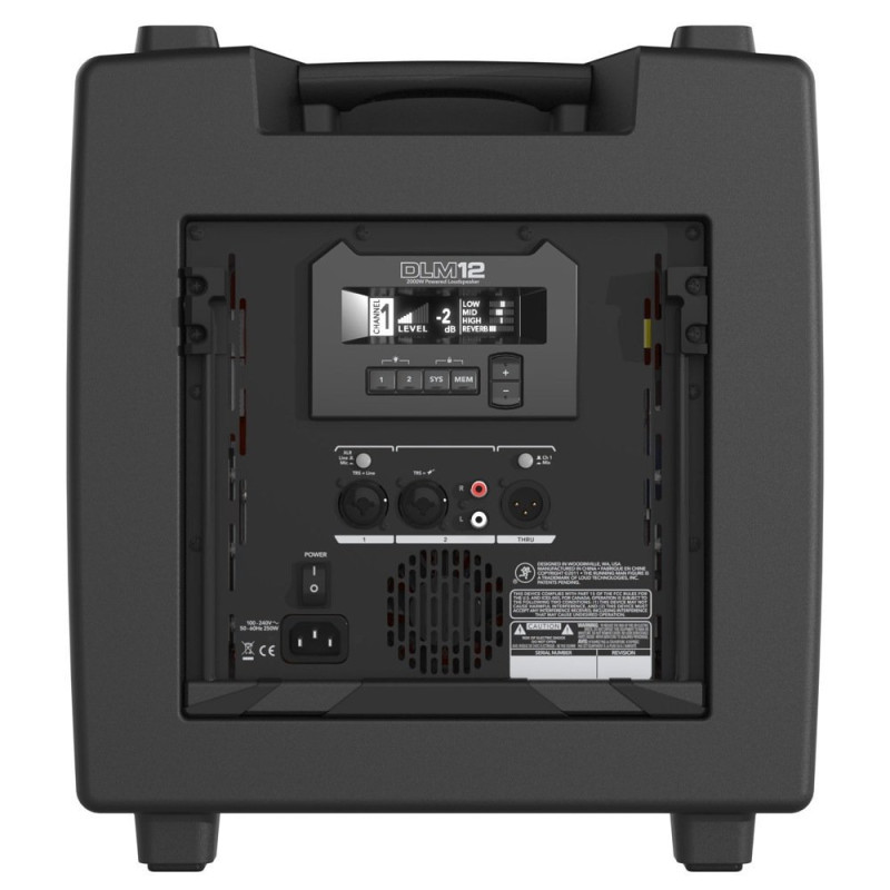 Кабинет Mackie DLM12 состоит из НЧ-динамика диаметром 12” и компрессионного ВЧ-драйвера 1,75” для сверхчёткого воспроизведения высоких частот, оба драйвера – с ферритовыми магнитами. ВЧ-динамик помещен в волновод для охвата большей территории, коническая дисперсия составляет 90 градусов. Усилители класса D, охлаждаемые при помощи кулера с вариативной скоростью, предлагают максимальную энергоэффективность, устраняя необходимость в тяжелых блоках питания и массивных радиаторах. Пиковая мощность системы составляет 2000 (1000+1000) Вт, номинальная RMS – 1000 (500+500) Вт. Максимальное звуковое давление составляет 128 дБ при частотном диапазоне от 38 Гц до 20 кГц, и можно услышать многие нюансы, особенно при добавлении в систему сабвуфера (например, DLM12S). На тыловой панели расположены входы на комбинированных разъемах XLR/TRS и RCA, а также сквозной выход XLR-M THRU для посыла копии сигнала источника на другой громкоговоритель с использованием обычного кабеля XLR. Таким образом можно строить многоканальные системы из АС как этой серии, так и других. Цифровой микшер с OLED-экраном предлагает независимые регулировки канала, трёхполосный эквалайзер и 16 эффектов на каждый канал (включают в себя хорус, реверберацию, дилэй и т.д.), многополосный подавитель обратной связи, шесть пресетов режимов работы, выравнивание задержки до 300 мс, три ячейки памяти для настроек и динамическую защиту для DSP.