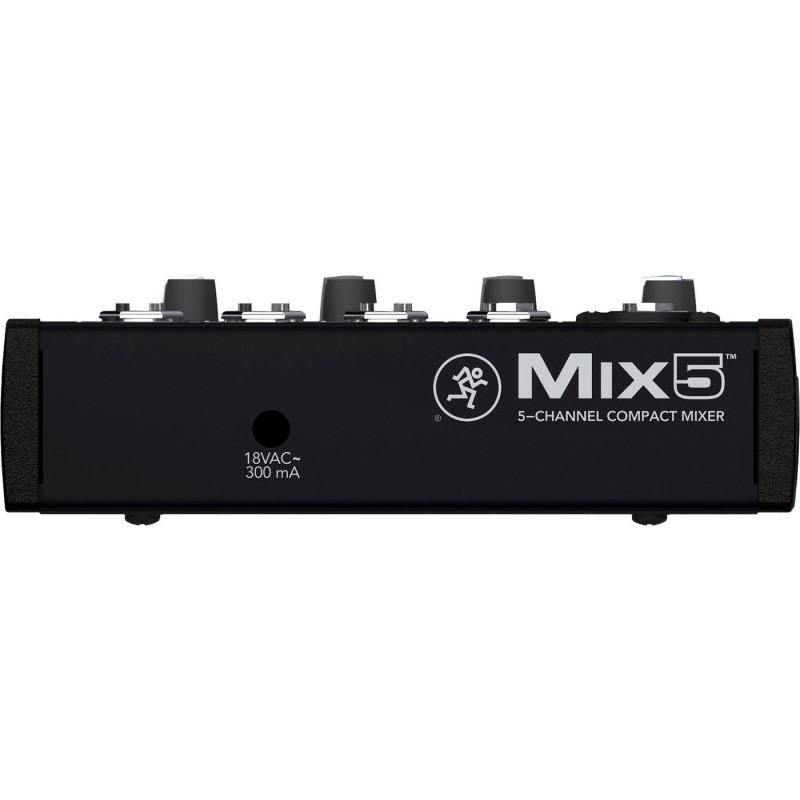 В Mackie Mix5 первый вход допускает раздельное подключение в микрофонный и линейный каналы, так как балансный XLR-вход имеет постоянное фантомное питание+15V для конденсаторного микрофона, а динамический микрофон следует подключать в разъем Jack. На разъемах Jack TS выполнены выходы, а отдельный выход на наушники с отдельным регулятором громкости - 1/4" TRS Jack. Для первого входа можно применить двухполосный эквалайзер с регулировкой частот 80 Гц и 12 кГц. Для конденсаторных микрофонов доступно фантомное питание. Наконец, в наличии стереопары входов и выходов RCA для записи или воспроизведения с бытовых источников и на них. На первом канале есть ручка паннинга с индикатором, на двух стереопарах – ручки регулировки баланса. Для контроля звука можно воспользоваться четырёхсегментным двухканальным светодиодным регулятором уровня. Внешний источник питания позволяет использовать микшер во всем мире.