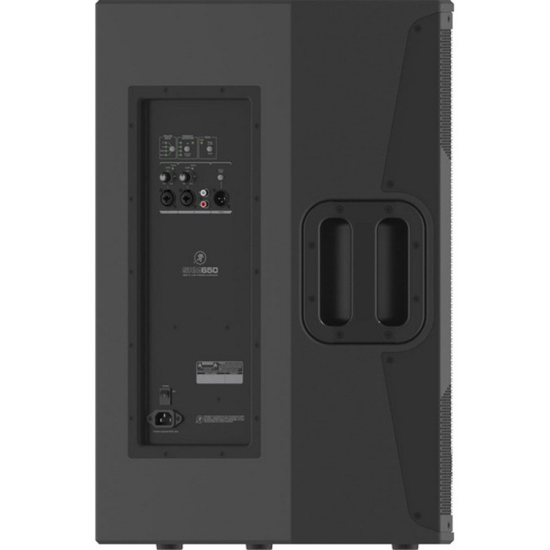 Кабинет Mackie SRM650 состоит из высокопроизводительного вуфера диаметром 15” и компрессионного ВЧ-драйвера 1,4” с титановым куполом для сверхчёткого воспроизведения высоких частот. ВЧ-динамик помещен в крупноформатный волновод для охвата большей территории, дисперсия составляет 90х50 градусов. Усилители класса D предлагают максимальную энергоэффективность, устраняя необходимость в тяжелых блоках питания и массивных радиаторах. Пиковая мощность системы составляет 1600 (800+800) Вт. Максимальное звуковое давление составляет 133 дБ при частотном диапазоне от 39 Гц до 20 кГц, и можно услышать многие нюансы, особенно при добавлении в систему сабвуфера (например, SRM1850 или SRM2850). На тыловой панели расположены ручки регулировки уровня с индикатором клиппинга, а также входы на комбинированном разъеме XLR/TRS и сквозной выход XLR-M THRU для посыла копии сигнала источника на другой громкоговоритель с использованием обычного кабеля XLR. Таким образом можно строить многоканальные системы из АС как этой серии, так и других.