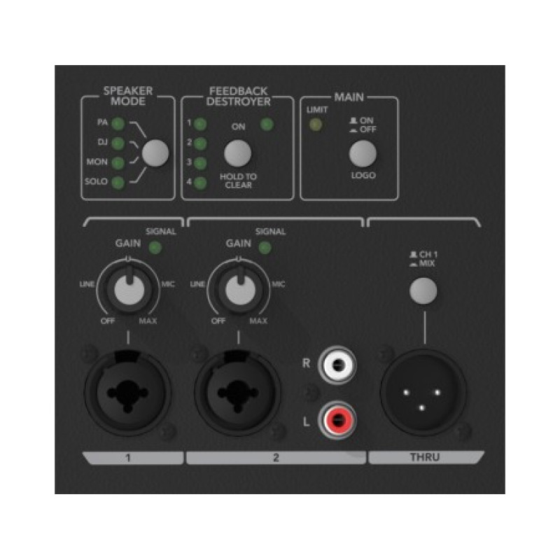 Реализована схема двойного усиления bi-amp: отдельно усиливаются сигналы на нижние и верхние частоты. Также в АС данной серии внедрена система Mackie High Definition Audio Processing и такие инструменты оптимизации, как режимы АС для конкретных приложений (всего 4 режима) и подавитель обратной связи.