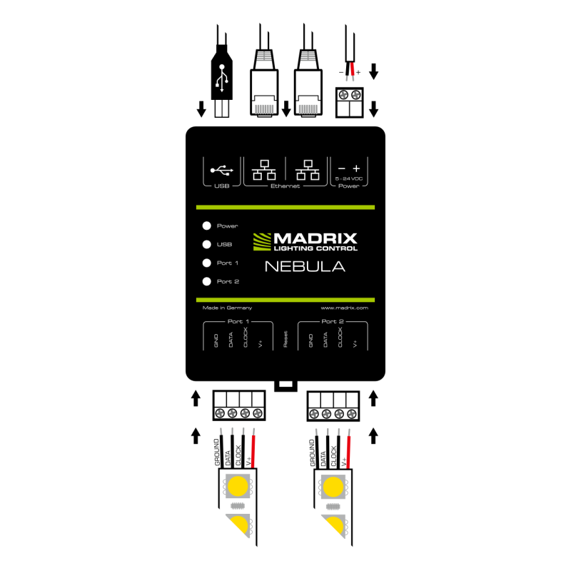 Приборы Madrix Nebula производятся в пластиковом корпусе компактного размера для установки на DIN-рейку, либо к стене, оборудованы высококачественными разъемами PHOENIX. 3 светодиодных индикатора состояния отображают статус устройства.