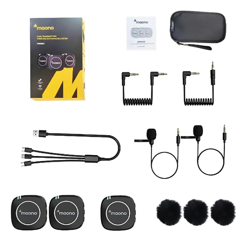 Maono AU-WM820 A2 - сверхкомпактная беспроводная микрофонная радиосистема, состоящая из приемника и двух передатчиков с двумя петличными микрофонами.