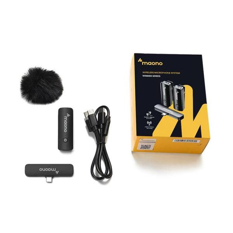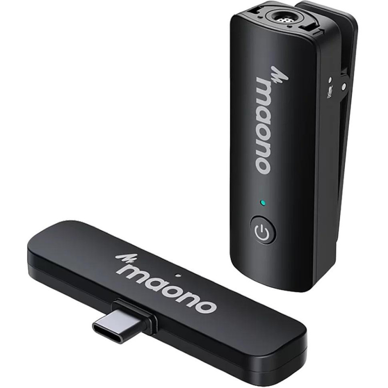 Maono WM600 C1 - компактная беспроводная одноканальная радиосистема для смартфонов, состоящая из приемника с коннектором USB-C и передатчика с встроенным микрофоном.