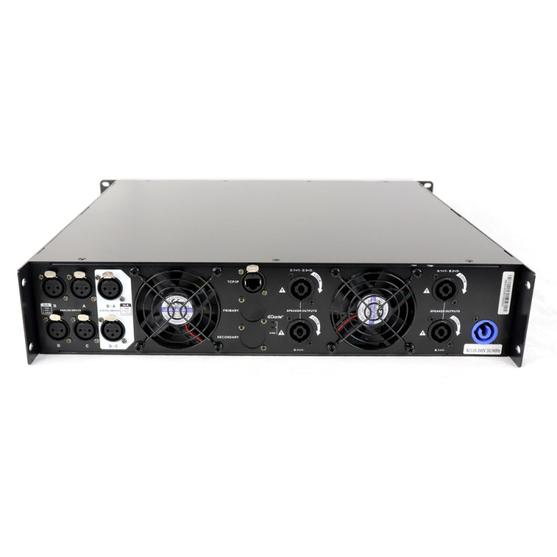 Усилительная часть прибора по своим функционально-техническим параметрам нисколько не уступает управляющему процессору. В качестве оконечных каскадов усиления использованы модули D-класса PASCAL, не нуждающиеся в подтверждении репутации. По желанию заказчика могут быть также установлены IC POWER или POWERSOFT DIGAM. Мощность каждого из 4 выходных каскадов составляет 1000 Вт при 4 или 8-омной нагрузке. Для использования в системах трансляции предусмотрен и 100-V режим работы.