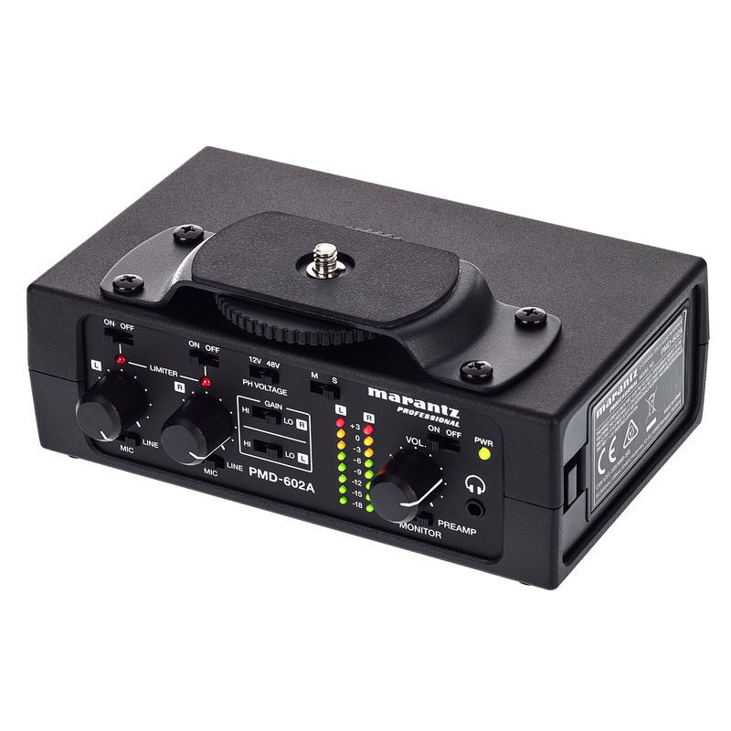 Marantz PMD602A представляет собой двухканальный DSLR аудиоинтерфейс с фантомным питанием +48 В, двумя комбо входами XLR, лимитером и мониторным входом для наушников. PMD-602A — двухканальный интерфейс с батарейным питанием, который позволяет использовать микрофоны или аудиоустройства линейного уровня с DSLR камерами или полевым записывающим оборудованием.Его профессиональные функции включают в себя комбо входы XLR с возможностью выбора фантомного питания 12 В или 48 В для конденсаторных микрофонов, чувствительность микрофонного входа и линейного входа с двухступенчатой регулировкой усиления, 3.5мм линейный вход и лимитирование для соответствия усиления. Линейный мастер выход позволяет правильно подавать входной сигнал любой камеры или рекордера при мониторинге через выход для наушников. PMD-602A также имеет крепление 1/4 «x 20 сверху для крепления камеры и разъем для штатива в нижней части для дополнительной универсальности.