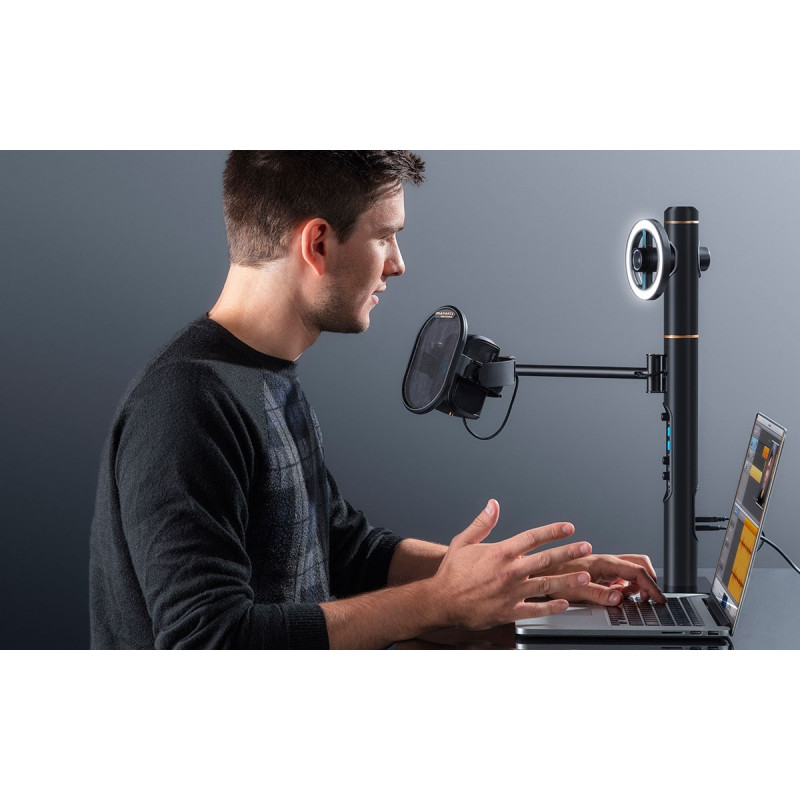 Marantz Turret аудио-видео система для записи блогов, подкастов и проведения вещаний и трансляций. Устройство выполнено в виде единой конструкции, не требует сборки и устанавливается на твердую поверхность без необходимости закрепления. Данная модель имеет очень простое управление, что позволяет сразу же приступить к творческому процессу, не тратя времени на настройку оборудования.Marantz Turret включает в себя конденсаторный электретный микрофон с кардиоидной характеристикой направленности и диаметром капсюля 14 мм. Конденсаторный тип микрофонов считается наиболее подходящим для записи голоса, так как он охватывает широкий спектр частот и имеет большую чувствительность, чем динамический микрофон, что позволяет микрофону передать все нюансы человеческого голоса. Кардиоидная направленность помогает микрофону лучше «слышать» звук спереди от капсюля, не воспринимая звуки по бокам и сзади от него. Частотный диапазон 150 Гц – 15 кГц, качество записи 16 бит/48 кГц. Также микрофон имеет встроенный аттенюатор, который понижает входной сигнал на -10 дБ. Данная функция будет полезна при записи громких звуков и позволит избежать перегрузки. Микрофон имеет свой поп-фильтр и располагается на подвижной стойке-пантографе, максимальная длина которой 860 мм. Как и веб-камера, микрофон оснащен встроенной цветной индикацией активности, а также кнопкой выключения, которая располагается на панели управления.Данная система полностью совместима с программами Skype и Face Time и может использоваться для видеозвонков. Присутствует выход для наушников на разъеме 1/8'' Jack TRS, а также общий выход на разъеме 1/8'' Jack TRS, с помощью которого можно подключать устройство к микшерному пульту или к акустической системе. Коммутация с компьютером осуществляется через порт USB type-C, который обладает высокой скоростью передачи данных, что, соответственно, существенно уменьшает задержку. Для подключения флэш-карт имеются 2 разъема USB to device. Питание осуществляется с помощью адаптера, который поставляется в комплекте вместе с кабелем USB-C/USB-A.Marantz Turret позволяет записывать высококачественные видеоролики не затрачивая время на установку и настройку, не требует дополнительных устройств для полноценной работы, а также отличается стильным и приятным дизайном.
