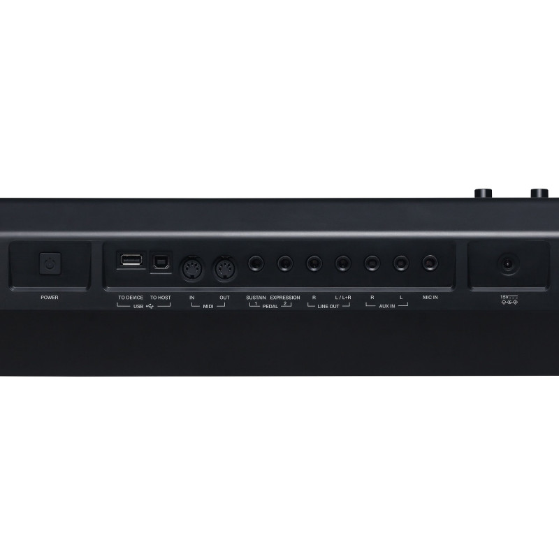 Для подключения внешнего источника звука есть стереофонический небалансный вход на 2 разъемах 1/4'' Jack TS. Такими же разъемами представлен небалансный линейный стереовыход. Есть 2 входа для педалей сустейна и экспрессии, вход для динамического микрофона и выход для наушников, каждый из которых использует разъем 1/4'' Jack TRS. Микрофон и педали в комплект не входят и приобретаются отдельно.