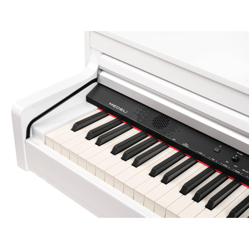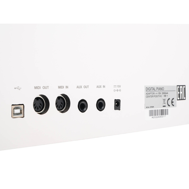Medeli DP420K-PVC-WH представляет собой стационарное цифровое пианино, использующее полноразмерный корпус с блоком из 3 педалей (Sustain, Soft и Sostenuto) и пюпитром.