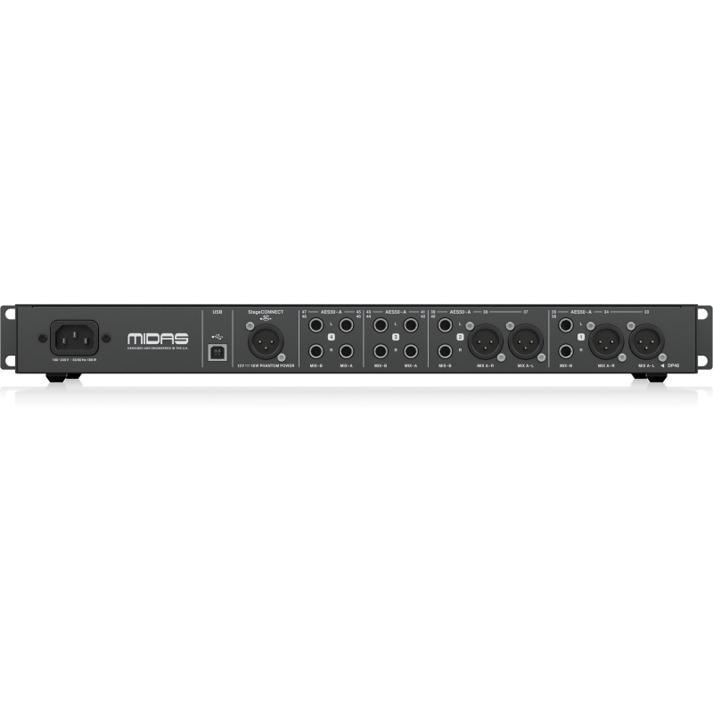 4 порта AES50 1-4 с PoE передают 48 выходных каналов со входа AES50-A и предназначены для подключения персональных мониторных микшеров Midas DP48 или компактных стейджбоксов Midas DL8. Порты AES50 1-4 принимают по 8 входных каналов 1-8, 9-16, 17-24, 25-32 и коммутатор объединяет их в один поток. Порт AES50-A Master может коммутировать выходные каналы 1-32 со входа AES50B или со входов AES50 1-4.