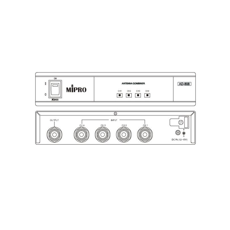 AD-808 предназначенный для объединения сигнальных антенных выходов от двух до четырех передатчиков MI-909Т в один выходной сигнал и передачи одной антенной радиочастотного сигнала на дальнее расстояние. Значительно устраняет интермодуляционные искажения. Является незаменимым устройством для профессиональных многоканальных беспроводных систем.