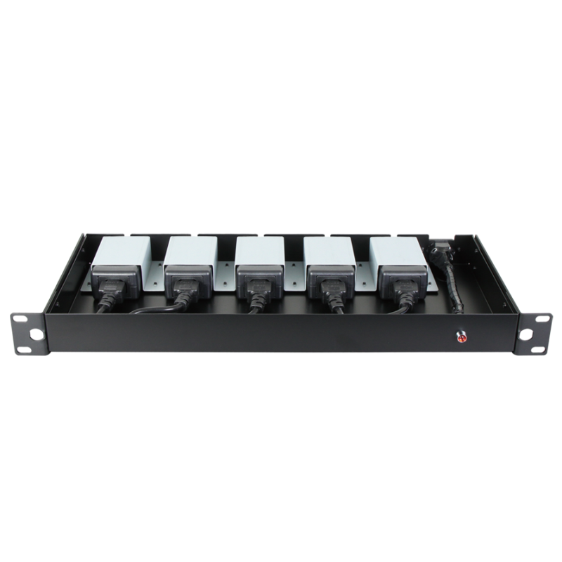 Передняя панель имеет индикатор питания, а задняя панель имеет один входной разъем переменного тока и 5 выходных разъемов постоянного тока. Кроме того, есть кронштейн, который вмещает 5 блоков питания, и предусмотрены винты для крепления кронштейна к нижней части корпуса сбора.