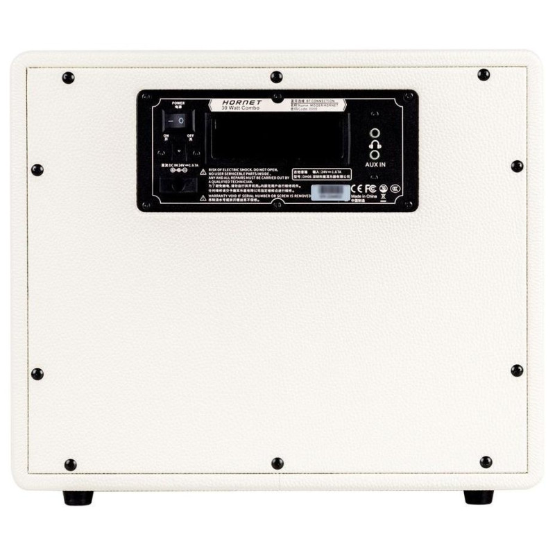 Инструментальный вход представлен стандартным разъемом 1/4'' Jack TS. Вход AUX для внешнего источника аудиосигнала представлен разъемом 1/8'' Jack TRS. На таком же разъеме сделан и выход для наушников. Для передачи аудио беспроводным способом можно использовать Bluetooth. Панель управления комбо оснащена ЖК-дисплеем, отображающим все параметры и их значения. Энергообеспечение происходит от комплектного адаптера на 24 V DC.
