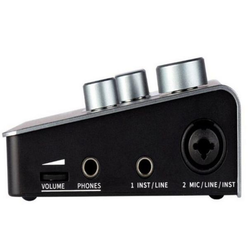 Корпус устройства изготовлен из металла, интерфейс удобно расположить на столе, а все элементы управления находятся сверху. На лицевой части корпуса расположен основной регулятор уровня громкости, два регулятора предусиления входных каналов и два светодиодных измерителя уровня. Для активации высокоомного режима, который используется при подключении электрогитар, имеются две кнопки Inst. Аудиоинтерфейс оснащен фантомным питанием +48 В, которое необходимо для подключения конденсаторных микрофонов. Для включения питания имеется отдельный переключатель. С помощью кнопки S.DRCT можно переключать тип мониторинга входных каналов, например, при подключении стереопары микрофонов каждый микрофон будет воспроизводиться в левом или правом канале. Когда эта кнопка отключена то оба канала будут воспроизводиться в суммирующем моно режиме. Эта функция не влияет на запись и применяется только при мониторинге через наушники или акустические системы. Далее расположен регулятор MIX, который используется для регулировки уровня громкости прямого мониторинга или микширования между сигналом с DAW компьютера и входными каналами.