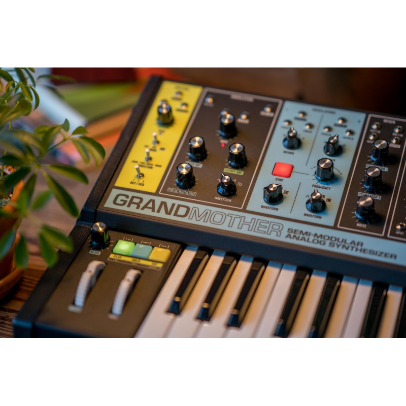 MOOG Grandmother аналоговый синтезатор полумодульный с встроенным арпеджиатором, секвенсором и ревербератором. Схемотехника Grandmother основана на классических модульных Moog Modular и дополняет линейку semi modular синтезаторов Mother-32, DFAM и Eurorack. Grandmother имеет полумодульную конструкцию, рассчитанную даже на тех музыкантов, кто не очень хорошо разбирается в патчинге.