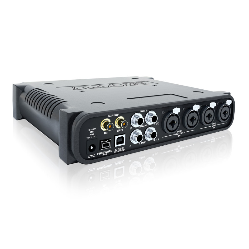 Многоканальная система записи 6x8, интерфейс FireWire IEEE1394 - 24-bit/96kHz, 4INх2OUT балансные TRS (1/4 JACK), 8 MIC IN (XLR/TRS/48V), ADAT I/O, MIDI I/O, выход на наушники.
