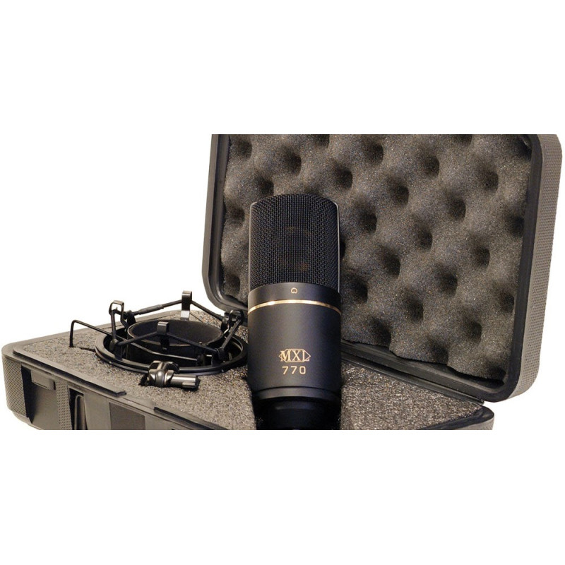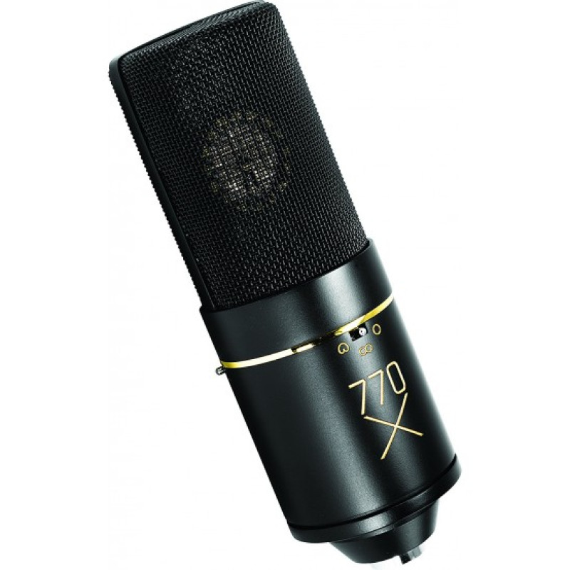 MXL 770x студийный микрофон.Данная модель от американской фирмы MXL являет собой модернизированную версию сверхпопулярного микрофона MXL 770. Главным ее отличием от предшественника является использование капсюля с позолоченной мембраной и большим диаметром (32 мм), а также переключателем между 3-мя вариантами диаграммами направленности: кардиоидной, восьмёркой и стандартной круговой. Эта особенность дает пользователям возможность использовать данную модель для записи голоса в студии, а также для богатой палитры всевозможных музыкальных инструментов. В числе прочих преимуществ MXL 770X есть низкий уровень внутренних шумов, а также применение на корпусе устройства переключателей аттенюатора (0/-10 дБ) и высокочастотного фильтра.