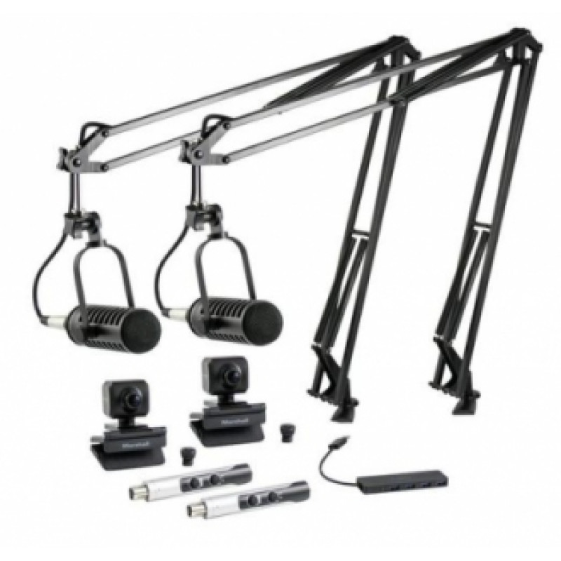 MXL VPS DUO представляет собой бандл или комплект оборудования для создания видео подкастов и стримов, состоящий из двух высококачественных вещательных микрофонов MXL BCD-1, питающихся по USB шине, двух миниатюрных PCV камер высокого разрешения (до 1920 x 1080 p) Marshall СМ 502-U3, двух XLR-на-USB адаптеров MXL Mic Mate Pro, двух сочлененных стреловидных микрофонных стоек BCD-1, USB хаба MXL USB Hub и двух 6-миллиметровых сменных объективов с 47-градусным углом обзора. MXL BCD-1 Live Broadcast Dynamic Microphone - выдающийся динамический вещательный микрофон со специальной сочлененной шарнирной стойкой и встроенным анти-шоковым креплением, предназначенным для нейтрализации вибрации и предотвращения появления нежелательных шумов. MXL BCD-Stand - сочлененная стойка с пружинами, обеспечивающая профессиональную гибкость позиционирования микрофона для оптимальной записи. Стойка может крепиться к столу с помощью струбцины или шарнирного крепления. Миниатюрная PCV камера Marshall CV502-U3 обеспечивает запись видео с разрешением до 1920 x 1080p (full-HD) через один USB 3.0 кабель. Для получения разных углов обзора доступны заменяемые линзы. Питание камеры осуществляется по USB 3.0. MXL Mic Mate Pro - XLR-на-USB адаптер с регулятором гейна. MXL USB Hub – хаб с четырьмя входами и одним выходом USB 3.0. Комплект MXL VPS DUO содержит все необходимое для создания видеоподкастов на домашнем компьютере или ноутбуке.