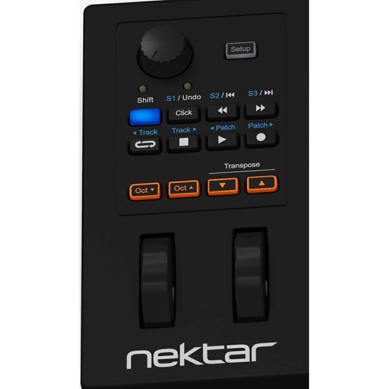 Семь кнопок, предназначенных для управления DAW, находятся по центру. Они расширяют функциональные возможности и также могут быть переназначены для выбранного DAW, даже если он не поддерживается Nektar Daw Integration. Для каждой из 7 кнопок можно запрограммировать первичное и вторичное сообщение, что дает всего 14 программируемых опций. Impact GXP – не только MIDI, но и DAW-контроллер, который имеет множество опций для самостоятельной настройки управления. Каждая из 14 назначаемых кнопок, колесо модуляции, футсвич, большой регулятор управления могут быть назначены для отправки сообщений MIDI CC. А назначаемые кнопки могут быть настроены для управления транспортом MMC. Меню, вызываемое кнопкой Setup, позволяет отправлять программные сообщения Bank LSB/MSB «на лету», настраивать одну из четырех кривых скорости, устанавливать глобальный MIDI-канал и назначать кнопки транспонирования.