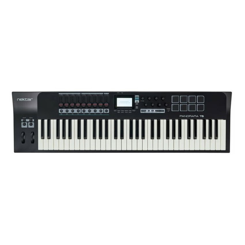 Nektar Panorama T6 – MIDI-клавиатура с синтезаторной механикой и 61 клавишей. Последние чувствительны к силе нажатия и поддерживают послекасание. Предусмотрено еще 62 органа управления, среди которых – колесо модуляции и колесо питч, кнопки сдвига октавы, кнопки Pad Repeat и Key Repeat. Возможности расширяют девять фейдеров, каждый – по 30 мм, восемь пэдов, чувствительных к давлению и силе нажатия, и такое же количество назначаемых энкодеров и назначаемых кнопок со светодиодами. Имеется шесть кнопок транспорта, снабженных подсветкой. Посередине находится экран LCD (128x64 точек). В нем можно регулировать контраст и включать фокусировку.