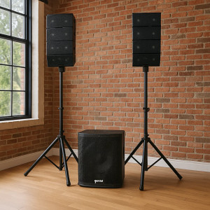 🔥 Несмотря на компактные размеры, система способна уверенно озвучить как небольшое помещение, так и открытую площадку. В её сердце — активный сабвуфер с 12-дюймовым динамиком и две сателлитные колонки, каждая из которых оснащена четырьмя 4" драйверами и твитером. Всё это обеспечивает чёткое, сбалансированное звучание на всём частотном диапазоне.
