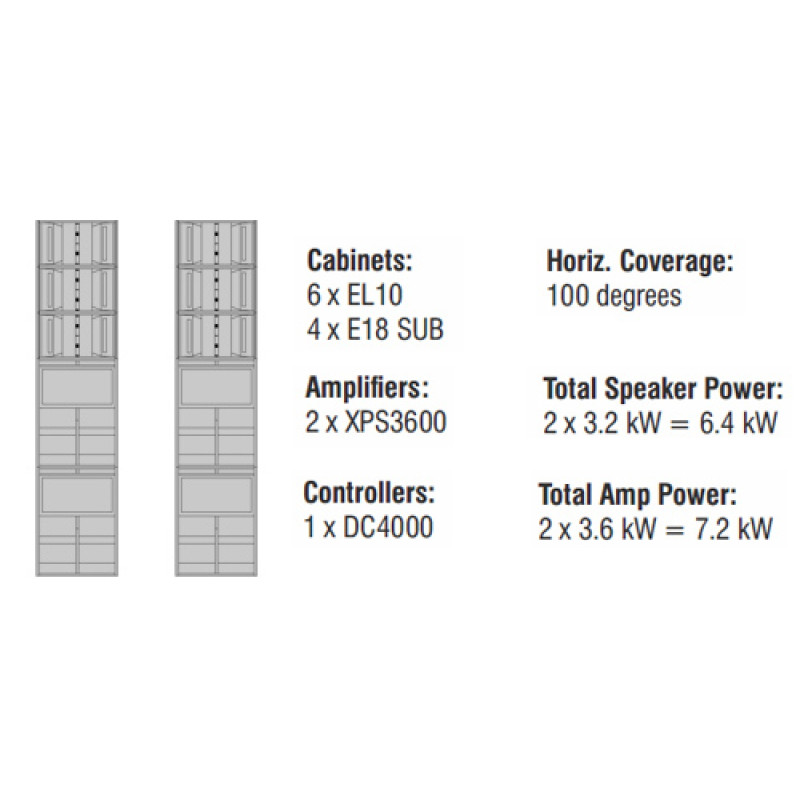 звукоусилительный комплект(с системным рэком, коммутацией). Состоит из: 6-ти систем EL 10, мощность 400 Вт RMS, импеданс 8 Ом, 4-х сабвуферов E 18 SUB, мощность 1000 Вт RMS, импеданс 8 Ом