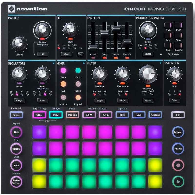 Novation Circuit MonoStation представляет собой парафонический аналоговый синтезатор, который создан на основе известного грувбокса Circuit и монофонического синтезатора Bass Station II. От популярных устройств синтезатор получил 32 динамических пэда с RGB-подсветкой, а от другого – аналоговый звуковой движок. Кроме этого, синтезатор представляет богатый набор функций для создания музыки. Синтезатор имеет парафонический и монофонический режимы работы, два независимо настраиваемых осциллятора, один мультирежимный (high-pass/low-pass/band-pass) аналоговый фильтр с переключаемой крутизной спада, 3 секвенсора и многое другое.