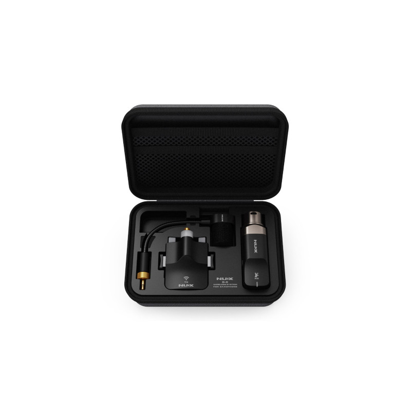 Беспроводная система NUX B-6 для саксофона также поставляется с футляром для хранения, который может заряжать передатчик и приемник одновременно, обеспечивая до 15 часов дополнительного времени автономной работы.