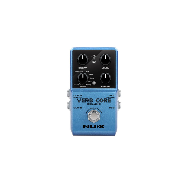 Nux Verb Core Deluxe — это педаль реверберации с 8 различными типами эффекта, включая Room, Hall, Plate, Damp, Shim, Spring, Tre-Verb и Mod Verb. Вы можете выбрать тип реверберации с помощью ручки Type.