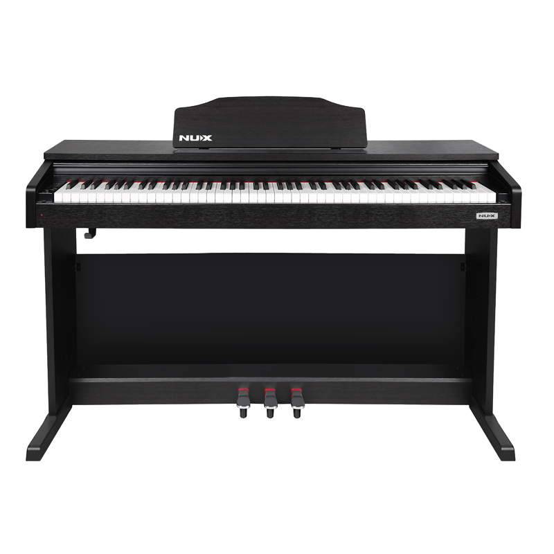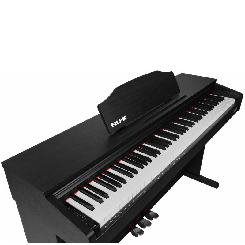 NUX WK-400 представляет собой доступное стационарное цифровое пианино, имеющее полноценный корпус с выдвижной крышкой, пюпитром и блоком с 3 педалями, отвечающими за стандартные параметры Sustain, Soft и Sostenuto.