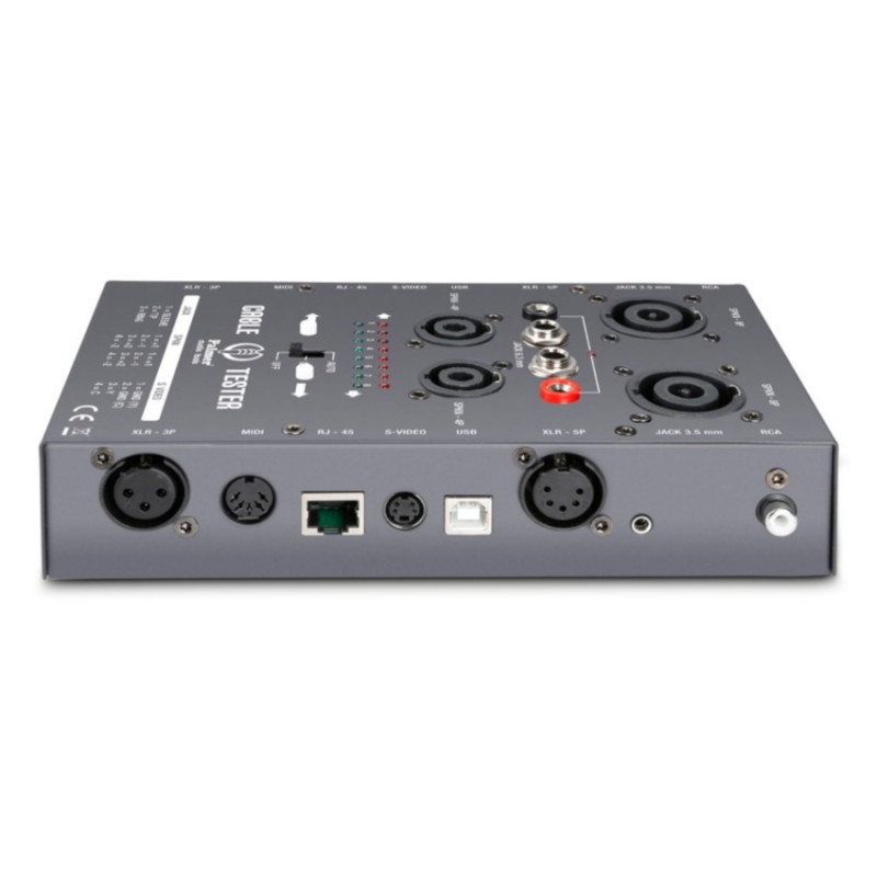 - Может тестировать кабели с 4-контактными и 8-контактными разъемами Speakon, XLR с 3-контактными и 5-контактными разъемами, 3,5 мм и 6,35 мм TS и TRS, RCA, DIN/MIDI, USB, RJ-45 и S-Video.