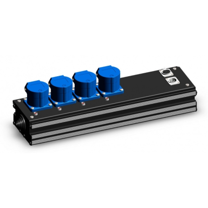 Partner-LM PLM30070.3 дистрибьютор питания, коробка проходная, 4 розетки PCE Schuko 16A, по канальные пружинные клеммы Wago для провода до 4 мм кв., Led-индикаторы, 1 разъем XLR3F, 1 разъем XLR3M, диаметр под трубу 37 мм или кабельный ввод Pg29, корпус из фирменного алюминиевого профиля и 1,5 мм стали.