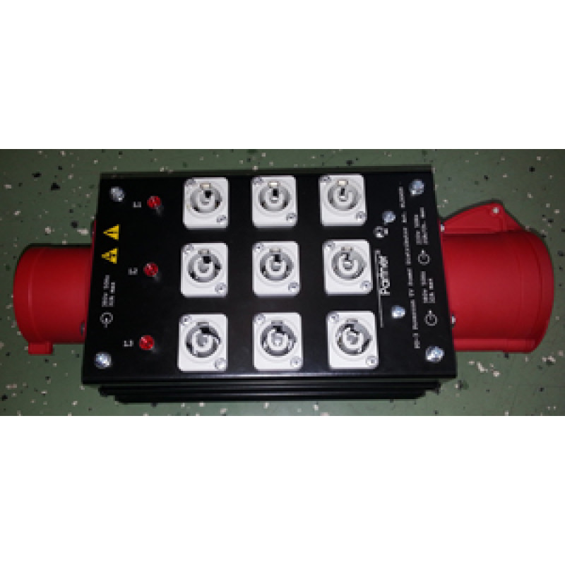 Partner-LM PLM30459 дистрибьютор питания на 9 розеток Powercon 20A (по три на фазу), LED-индикация фаз, проходной, ввод через встроенную вилка PCE CEE32A 5-pol. IP44, шлейфом встроенная розетка PCE CEE32A 5-pol. IP44, корпус из фирменного алюминиевого профиля и 1,5 мм стали. Габариты 300х132х129 мм.