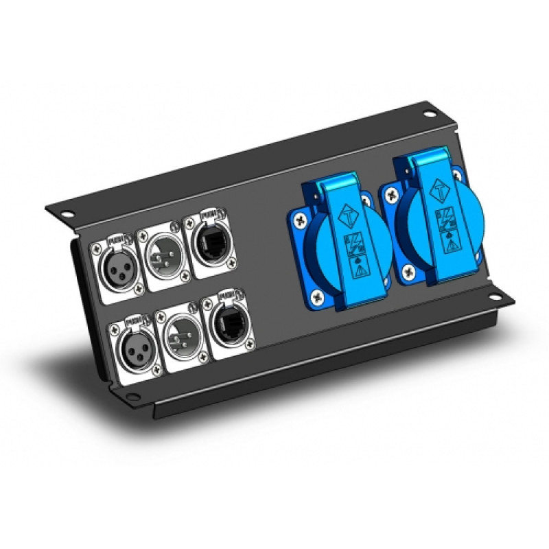 Partner-LM PLM80190.16 панель с разъемами: 2 разъема XLR 3-pin. Female, 2 разъема XLR 3-pin. Male, 2 разъема RJ-45, 2 розетки PCE Schuko 16A для напольного лючка PLM80100, PLM80600, PLM80300.