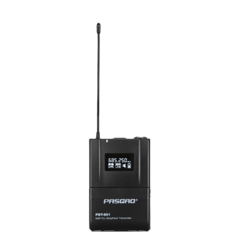 - Поясной передатчик PBT-801 помимо петличного микрофона также может быть оснащен головным микрофоном или гитарным шнуром