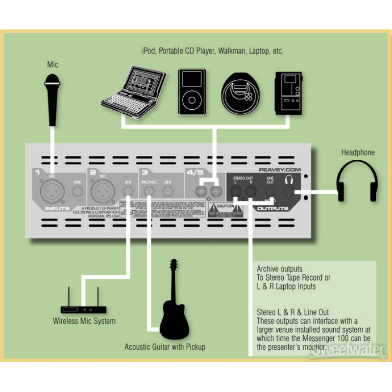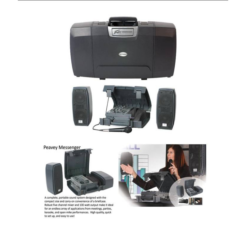 Peavey Messenger комплект акустики прекрасно подойдёт для деловых поездок. Этот комплект собирается за считанные секунды, и вы всегда можете положиться на него во время своих выступлений. 5-канальный микшер и 100 Вт мощности делают его незаменимым для совершенно разных задач, начиная от офисных презентаций, и заканчивая караоке. Верхняя крышка также может служить пюпитром для ваших заметок, нот или текстов.