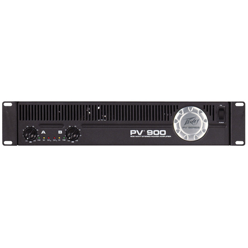 Peavey PV 900 усилитель мощности, 300 Вт RMS каждый канал на 4 Ом, 180 Вт RMS каждый канал на 8 Ом, 600 Вт RMS в мостовой схеме на 8 Ом, светодиодная индикация входного сигнала, DDT™ и сети 2 встроенных кроссовера 150 Гц. фильтр среза НЧ 40 Гц. регуляторы громкости Volume на каждый канал 2-х скоростной вентилятор с технологией Turbo V-Cooling™. защита акустики DDT™ 2 рэковых высоты.