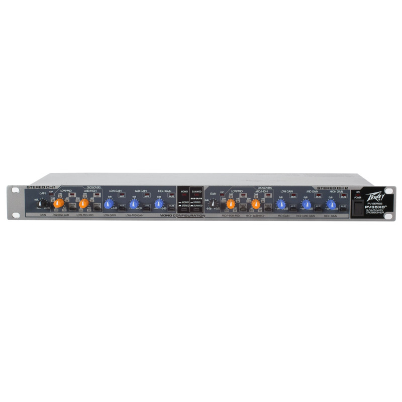 Peavey PV35XO кроссовер, 2 или 3 полосы в режиме стерео, 4 или 5 полос в режиме моно, все входы/выходы балансные XLR, переключатель режимов стерео / моно