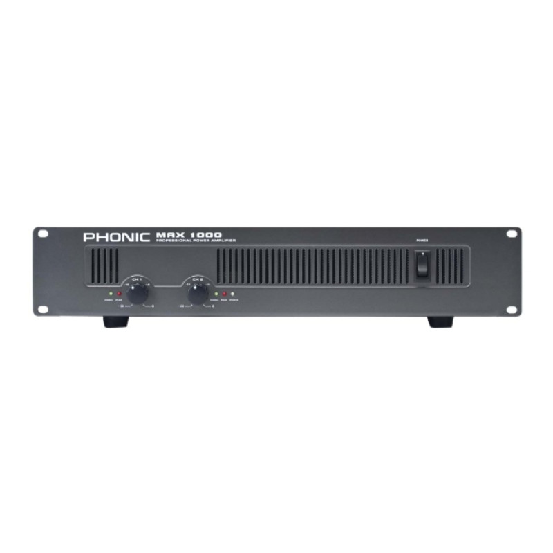 Phonic MAX 1000 усилитель мощности, 2х300Вт/4Ом (200Вт/8Ом bridge), 2U, вход: 2х XLR/Jack 6.3, выход: Speakon и винтовые клеммы.