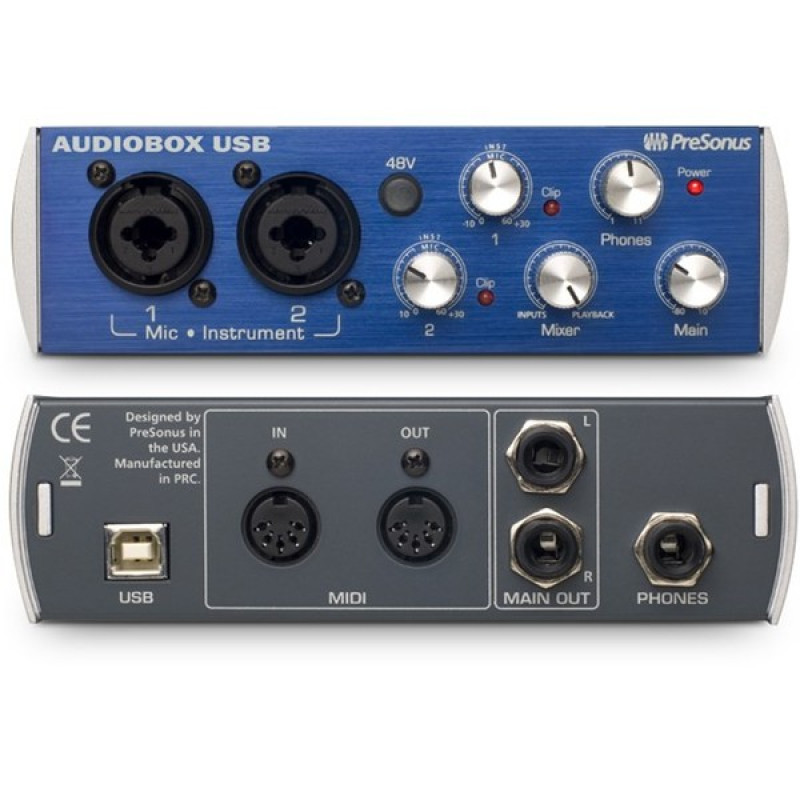 PreSonus AudioBox USB - это внешний USB-аудиоинтерфейс начального уровня, предназначенный для мобильного применения. Его АЦП и ЦАП работают в форматах вплоть до 24 бит/48 кГц, он обладает двумя комбинированными входами и двумя TRS-выходами, также на борту можно найти вход/выход MIDI и выход на наушники формата 1/4" Jack. Выходы представлены двумя стереовыходами на балансных разъемах 1/4" TRS Jack main out, выходом на наушники 1/4" TRS Jack, входом и выходом MIDI, а также разъемом подключения USB-кабеля типа B.