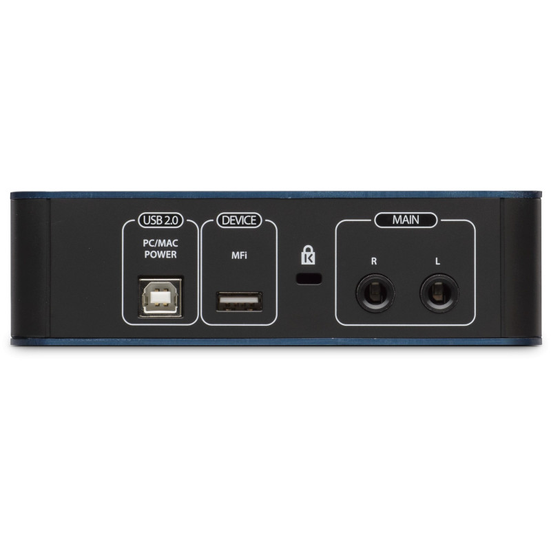 Его АЦП и ЦАП работают в форматах вплоть до 24 бит/96 кГц, он обладает одним микрофонным входом, одним инструментальным и двумя TRS-выходами, также на борту можно найти выход на наушники формата 1/4" TRS Jack.