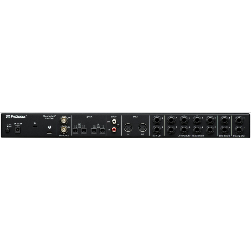 Для вывода аналогового аудиосигнала есть восемь линейных выходов, пары выходов Return и Preamp, а также основной стереофонический выход, каждый из которых сделан на разъеме 1/4" Jack TRS. Цифровые возможности подключения представлены интерфейсами SPDIF и ADAT, входы и выходы которых сделаны на разъемах RCA и Toslink соответственно. Для синхронизации с различными устройствами есть вход и выход Word Clock на коннекторах BNC. Также имеется полноценный MIDI-интерфейс с входом и выходом на стандартных 5-контактных разъемах. Подключение к компьютеру на базе Windows или macOS (поддерживаются только 64-битные системы) осуществляется по шине Thunderbolt 3 (совместим с версиями 1 и 2). Для коммутации используется порт USB-C.