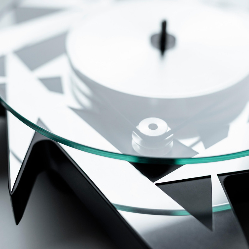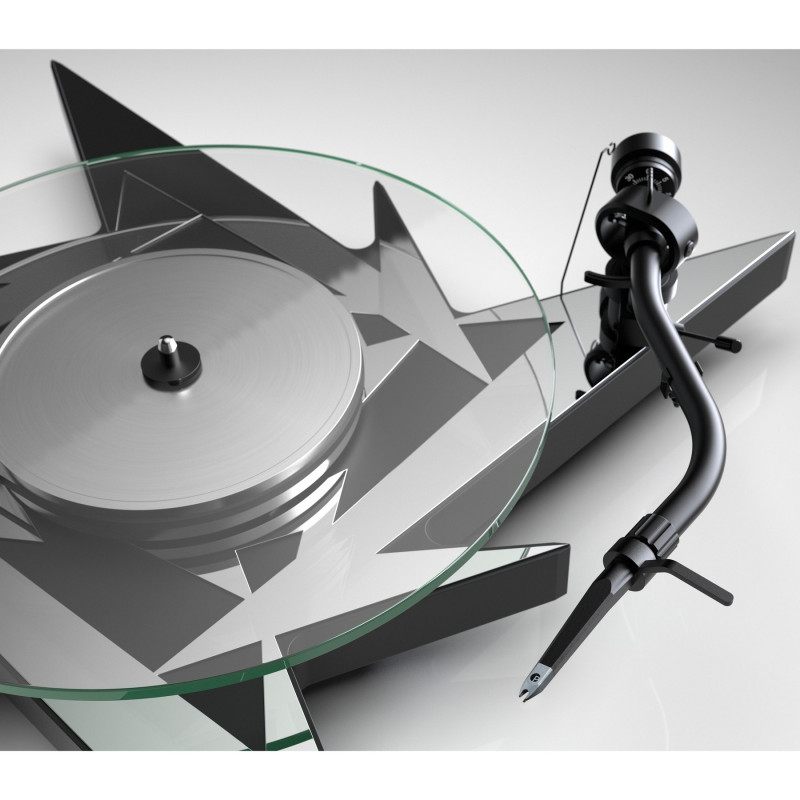 Чтобы не закрывать шасси, опорный диск на Pro-Ject Metallica Limited Edition сделан из закаленного стекла. Массивный диск вращается плавно и стабильно, а также хорошо защищает пластинку от вибраций. В модели используется субдиск, выполненный с высокой точностью из алюминия методом алмазной резки. Ось опорного подшипника изготовлена из стали, а корпус – из бронзы. Проигрыватель оснащен пассиковым приводом от малошумящего двигателя с виброразвязкой от шасси для устранения вибраций. Мотор подключен к электронной схеме стабилизации скорости, обеспечивающей также ее переключение между 33 1/3 и 45 оборотов в минуту. Скорость вращения пластинки 78 об./мин можно получить, переставив пассик на шкиве двигателя.
