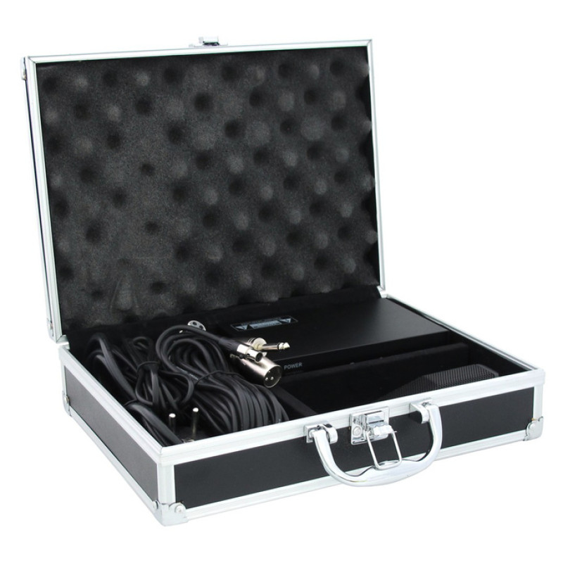 • микрофон • источник фантомного питания от 220 В • кабель XLR-XLR 5 метров • алюминиевый кейс.