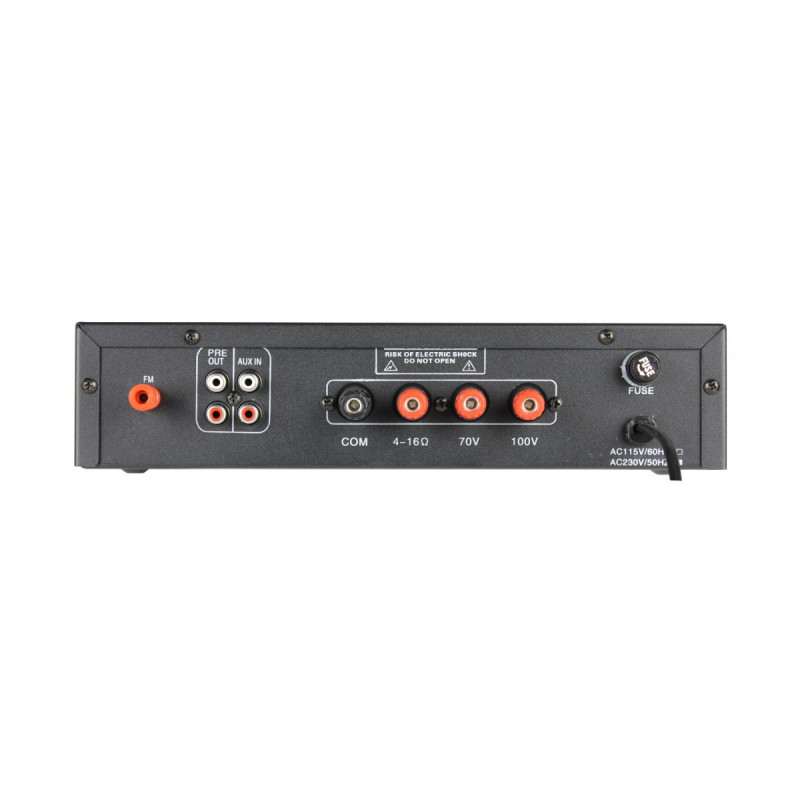 Proaudio MA-50UF трансляционный микшер-усилитель, предназначенный для организации фонового вещания в небольших магазинах, павильонах. В качестве источников сигнала можно использовать как встроенный USB/SD MP3-проигрыватель и FM-тюнер, так и внешние проигрыватели. Для этого у усилителя есть стереовход RCA с отдельным регулятором громкости. Для подключения динамических микрофонов или радиосистем имеется 1 вход TRS. Усилитель может работать как с трансформаторными АС, так и с низкоомными (сопротивлением не ниже 8 Ом).