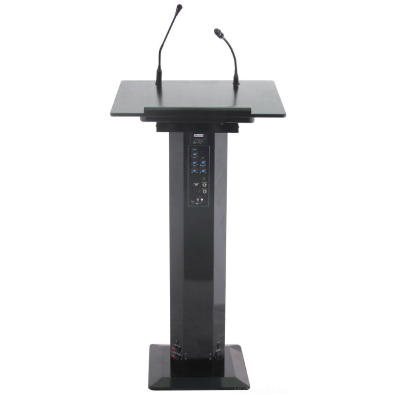 PROAUDIO PARLIAMENT-800B-LITE кафедра докладчика.PROAUDIO PARLIAMENT-800B-LITE Система представляет собой универсальное решение для проведения докладов, презентаций, трансляции речевых сообщений. Система исполнена в виде кафедры докладчика с подсветкой и микрофоном на “гусиной шее”. В стойку кафедры встроены 3 динамика по 5” и один ВЧ твиттер общей мощностью 100 Вт. Встроенный усилитель с помощью переключателя может работать, как на встроенные динамики, так и на внешнюю акустическую систему. Встроенный микшерный пульт имеет дополнительный разъем XLR/TRS для подключения дополнительного микрофона, а также линейный стереовход на разъемах RCA для подключения источника сигнала, например, DVD-плеера или ноутбука.Для каждого входа имеется регулятор громкости, а также общие регуляторы уровней верхних и нижних частот. Для подключения к внешним системам усиления звука имеется линейный небалансный выход TRS (джек).