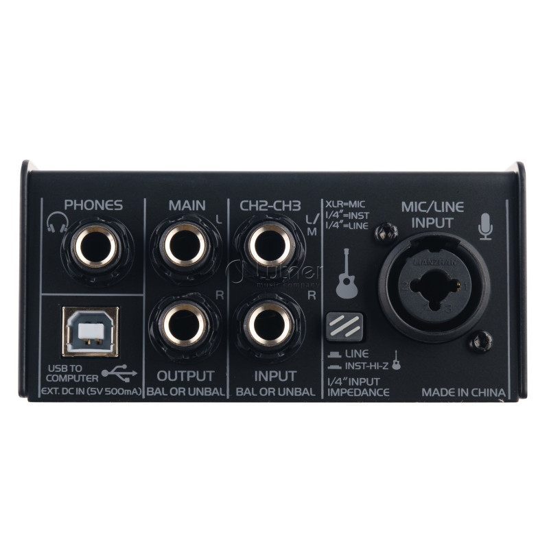 Интерфейс оснащен комбинированным входом XLR/Jack, стерео входом и выходом USB, стереовыходом для мониторинга и отдельным выходом для наушников.