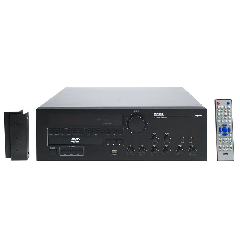 Трансляционный моноблок DVD/FM/USB/усилитель 2 зональный: 240Вт (RMS), 4/8/16Ом, 25/75/100В, 50Hz-15KHz. Вход: 4 х MIC (XLR), 1 xAUX (RCA), мастер регулятор уровня выходного сигнала, регулятор уровня сигнала на каждом входе, регулятор тембра, регулятор уровня выходного сигнала DVD, индикатор уровня сигнала. AM/FM тюнер: память на 7 станций? USB вход, переключаемые зоны, пульт Д/У Выход: VIDEO(RCA), S-VIDEO,клеммы. Размер: 4420 × 400 × 132мм, вес 22,5кг.
