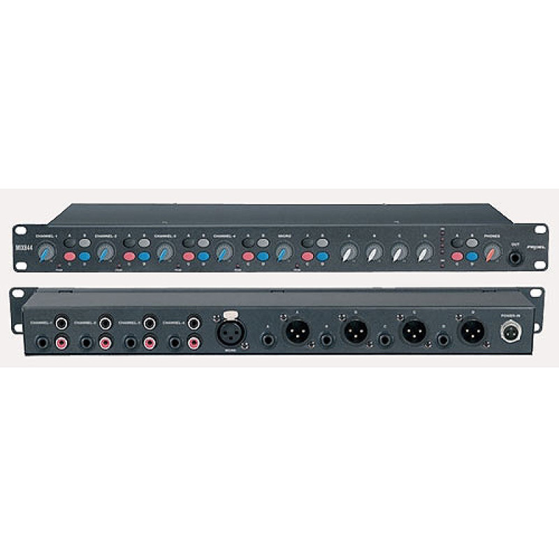 Proel AMIX4Z Компактный 4-х зонный микшер: Вход: 4 x LINE-L/MONO-R (Jack 6.3мм), 4 x LINE-L/MONO-R (RCA), 1 x MIC (XLR3) фантомное питание +18В, индивидуальный мастер регулятор уровня сигнала для каждой зоны; Для каждого входа: регулятор уровня сигнала, 4 кнопки назначения зоны, индикатор перегрузки. Выход: 4 х MASTER (XLR3), 4 х MASTER (RCA), 1 x HEADPHONE (Jack 6.3мм). Размер: 483x44х105мм, 19", 1U, вес 1.7кг. В комплекте: блок питания.