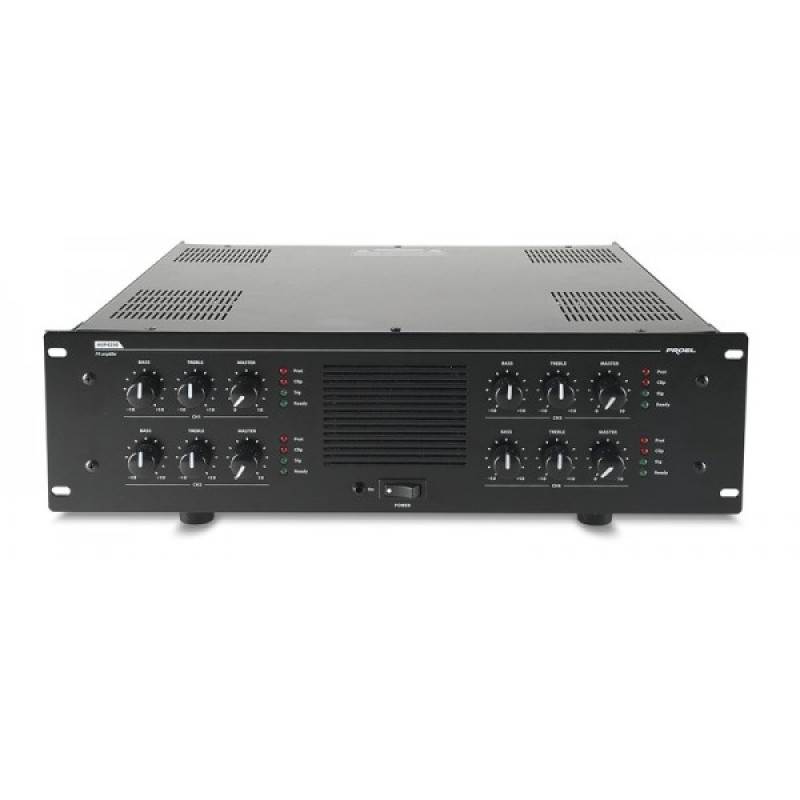 Трансляционный усилитель: 4x250Вт (RMS), 4x380Вт (мах), 4/8/16Ом, 100В, 50Hz-20KHz. Вход: 4 4 x LINE(XLR3), регулятор тембра и громкости BASS/TREBLE на каждом канале. OUT - клеммы. 483x133х350мм, 19", 3U, вес 25кг.