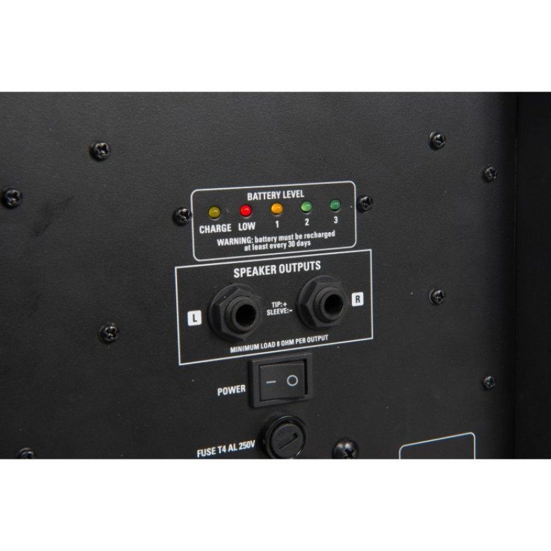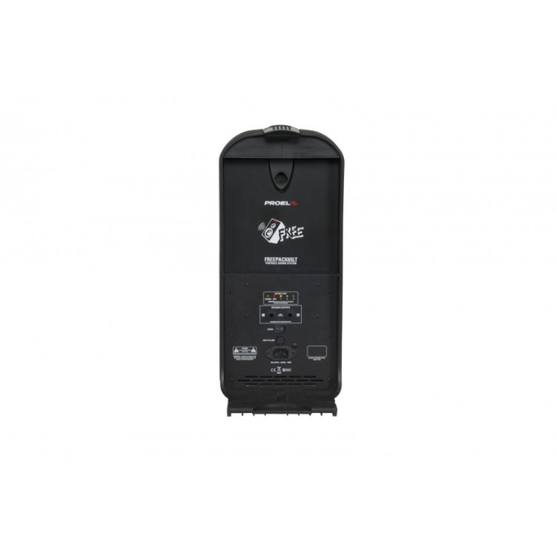 PROEL FREEPACK65LT комплект акустики, НЧ 6,5", ВЧ 2x3", дисперсия 100°x 80°, 8 Ом, 90 Гц-20 кГц, 92 дБ, усилитель класса D c SMPS (2X75 Вт, 20 Гц-20 кГц), микшер с 16 пресетами эффектов, встроенный MP3/WAVE с USB, SD-слот, LCD дисплей, входы 2xMIC/LINE (моно), 2x/LINE (стерео), выход 2xPRE-AMP, 2xREC, 1xAUX, 2xSPEAKER, работа на батарейках (2x12 В/2,8 А) 4-5 часов, питание 120 В или 230 В ~ 50/60 Гц, потребление мощности 300 Вт, вес 17 кг, размеры: система 565x440x196 мм, динамики 200x420x190 мм, микшер 352x440x196 мм